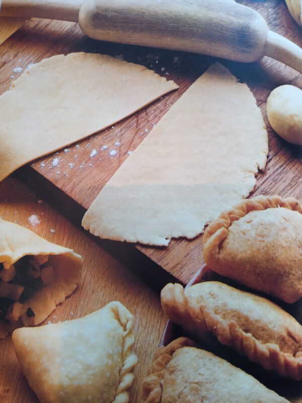 Podlogu za valjanje i tijesto pospite brašnom i razvaljajte u okrugle pogačice cca. 15 cm u promjeru. Prerežite sve krugove na pola i na ravno odrezani rub navlažite ravnu traku od sredine prema kraju. Presavijte dva kraja ravne strane kako biste formirali polukrugove u stožac. Napunite dvije trećine stošca povrćem i preklopite dobiveni šav. Sada formirane džepiće prodinstajte ili premažite uljem i zapecite u pećnici dok ne porumene.