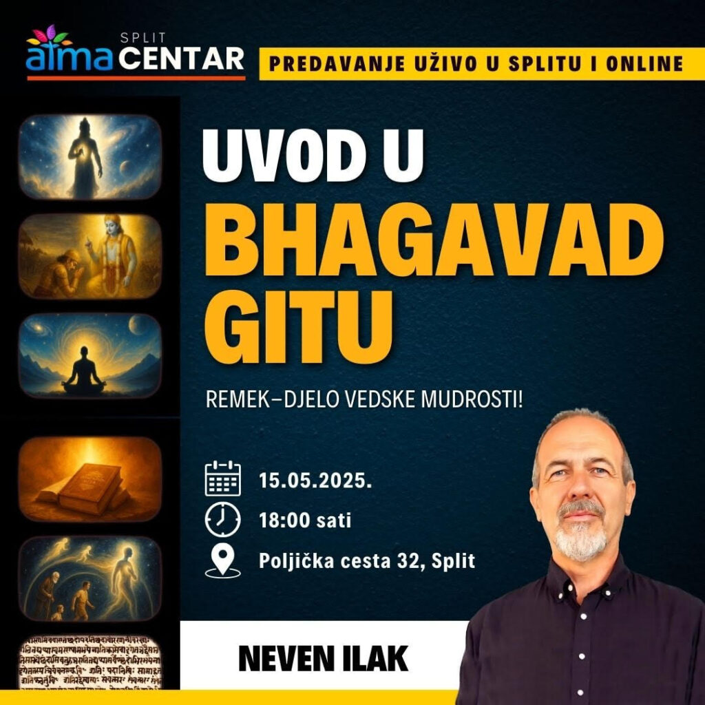 koje će se održati u četvrtak 15. svibnja 2025. u organizaciji Udruge Atma. Ovo predavanje je prvo u serijalu od pet predavanja koja će vas postepeno voditi kroz kompletnu mudrost Bhagavad-gīte, pružajući uvid u njezine ključne poruke i praktične primjene u svakodnevnom životu.